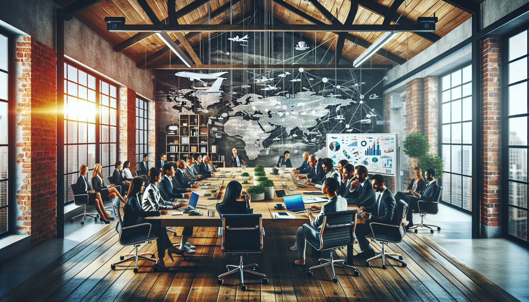 Фото: Делегация обсуждает бизнес-план за столом в современном лофте.